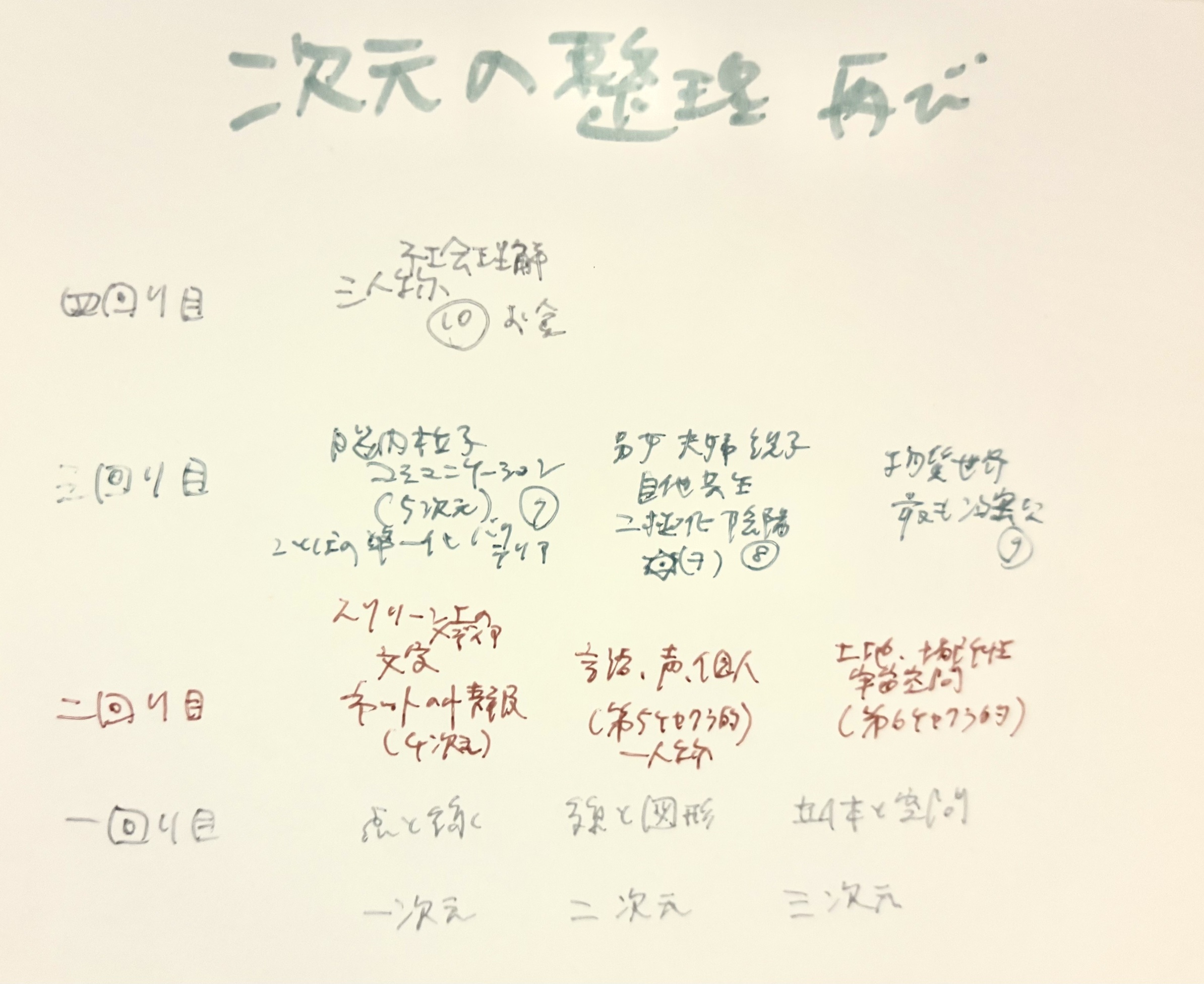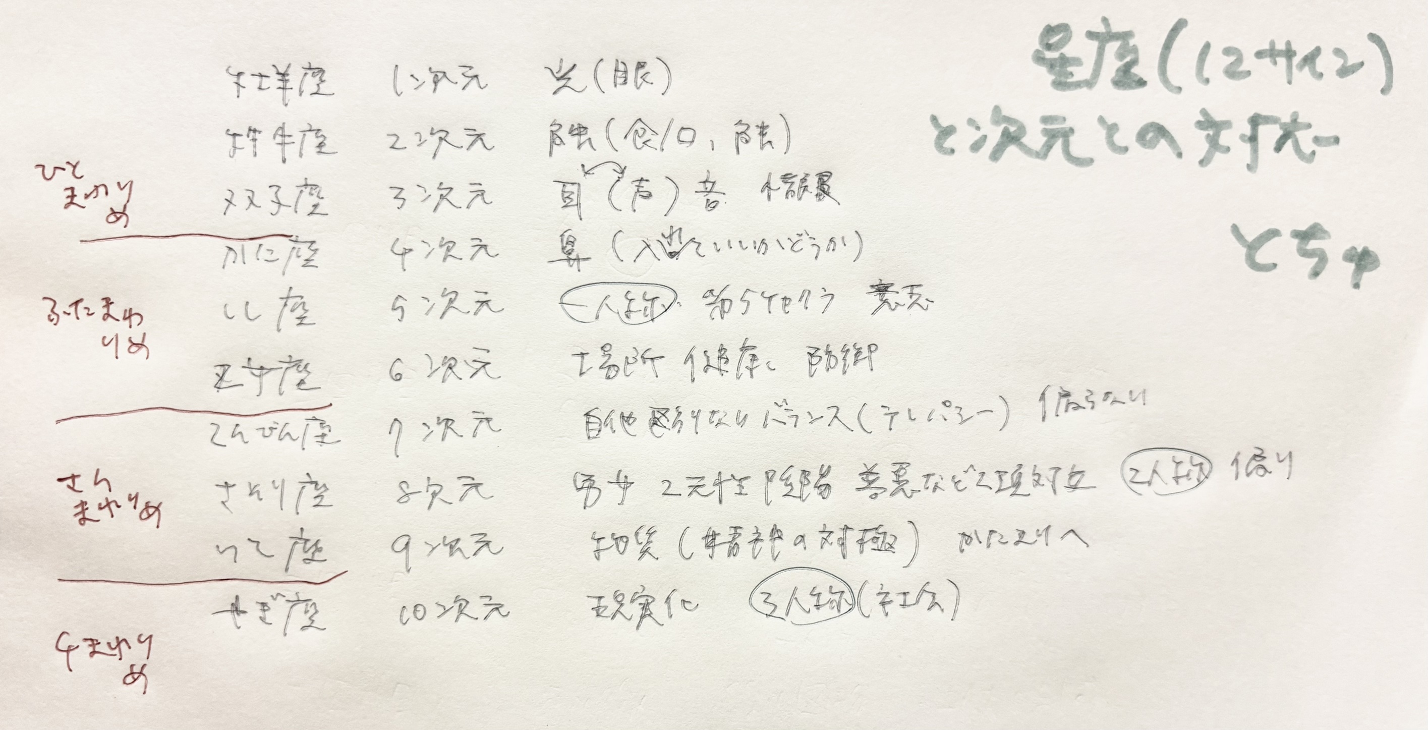 n* うん、やってみるです n* 片方は、というか、上のは5年くらい前に書いたやつだよね? n* そうだね。下のがー n* 私に説明するのに「人の場合はこっちね」って言って先日書いてくれたやつ n* うんうん。私が考えたのだよ? n* うんうん n* これっていわゆる「次元」のナンバーなの? n* うーん、どうだろう。その力の方向性が発生した「順番」ではあるかもだけど。特に最初のやつは n* ふーん。「時間」と「人間」のとこは、数字が行ったり来たりしているね。それも発生した順番ってこと? n* そうだと思う n* 4番目が直線の時間っていうのは、ドラえもんのタイムマシンみたいな感じだね。過去と未来が現在を通過して一直線って n* だねだね。で、5と6があんまり見慣れないかもだけど、すごく典型的なちからで、宇宙で言うと、星と星って、引っ張り合わないと浮いていられないんだよね。お互いの重さで引っ張り合うことで、浮いた状態で安定した関係になる。これは、4の一直線の動きに対する反動というか、それを和らげるちからというか。で、これが連続すると、循環のちからになる。それにまた反動がはたらくと、上下のいわゆる地球で言う重力のようなものが発生する。下側と、その反動で上側に n* なるほどね。みんな前のちからの反動で次が生まれているって感じなんだね n* 最初の三つはほぼ同時に発生しているかもだけど。そうじゃないと物理的に顕現できないから n* うんうん。で、上下の力の反動で、周囲に散逸するちからになると。最後の11はその逆で集束する動き、それがワンネスかー n* 散逸するちからが「時間」になっているのは、空間は散逸できないからね。時間が分岐するかたちで散逸を担って、過去未来とも「可能性」、これはあくまで現在からの解釈の問題だけれども、パラレルな世界が出現してる n* その逆がワンネスなんだね n* ワンネスという言い方がちょっと派手なら、パラレルをすべて「今」に引き寄せて現在を解釈するちからとでも言った方がいいかもね n* あー、その方が分かりやすいかも。で、「ヒト」ならこっちって言って、一つずつずれた図を書いてくれたけど、これはなんで一つズレるの? n* んー、最初の「点」は物理では存在できないからかな?ヒトは概念を扱えるので「点」が存在してて、それを念頭に入れたうえで書いたのが2番目のやつです n* なるほど。「ゼロ」の存在とかと似てるね n* うんうん、そうそう。点が1人、あるいは一人称と言ってもいいけど、ヒトの意識の最小限?はここからなので。バスの中で書いてたので字が汚くてごめんして n* ううん。これを説明していたときの説明が面白かったんだけど n* 全部は書けないかもだけども、とりあえず書いてある文字が読めるようにはしようね笑 n* 3のとこは「最低安定」だっけ n* そうそう n* あと、4の三角錐で、瀬織津姫と宗像三女神ってのが面白かった。大祓の祝詞に登場する4人の水の女神さまもそういう構造だもんね n* そうみたいね。で、5に時間(直線)って書いたけど、これはもしかするとここに「時間」を適応させるのは合ってなくて、「最低世界分割」って言う方が合ってる、人間対応では。「木火土金水」(日本では「地水火風空」)の五行とか日本の母音の「あいうえお」とか、あとは星型の一筆書き、ここが直線的なんだけれども、星型は黄金比が形の中に含まれているので、そういった意味で「最低世界分割」っていうかね、数学で言うと素数みたいな感じ n* で、6と7は上の図の5と6と同じで、向かうちからと引っ張るちからなんだね。6は「マカバ」? n* うんうん。3と3が組み合わさったやつで、いわゆる「愛」の数字とも言われるけれども、向かうちからというのは、自分を相手に寄せて理解しようとするちからというのかな n* だから「愛」なんだね。じゃあ、反対に引っ張るちからは、自分本位になるの? n* んー、んー、自分の方に引き寄せて「分かるようにする」ちからっていうか、なので、名づけとか概念化、比喩なんかもこれで、ある意味、自分が「できる」と思うちからというのかなー、そんなイメージ n* へえー、普通で言う「逆」とは違うんだね n* そうだねー、逆っていっても「ネガティブ」になるのとは違うので・・・。向きが逆なちからではあるけど、役割が違うだけっていうか・・・ n* 7のとこには最初に「星座」って書いてあるけど n* あー、それがね、いわゆる自分の方に引き寄せて分かろうとするちからの代表って言うのかな。星の位置をね、多分、海を航海するときの指標にしたかったんだと思うけれども、かなり積極的に空の星を「解釈」しているよね n* 北斗七星も7だしな! n* そういえばそうだね笑 n* で、この向かう引っ張るのちからが強くなると、8の「循環」のちからを生むと n* うんうん。ここにインフィニティのマークをつけたけど、これは永遠にある意味、循環するちからとして働いている n* 時間の「直線」もどこまでも続くイメージがあるけど、ここはループで永遠